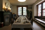 Long wooden table and wooden chairs. Fireplace and wooden framed window. The guests enjoy meals in a nice and quiet space.