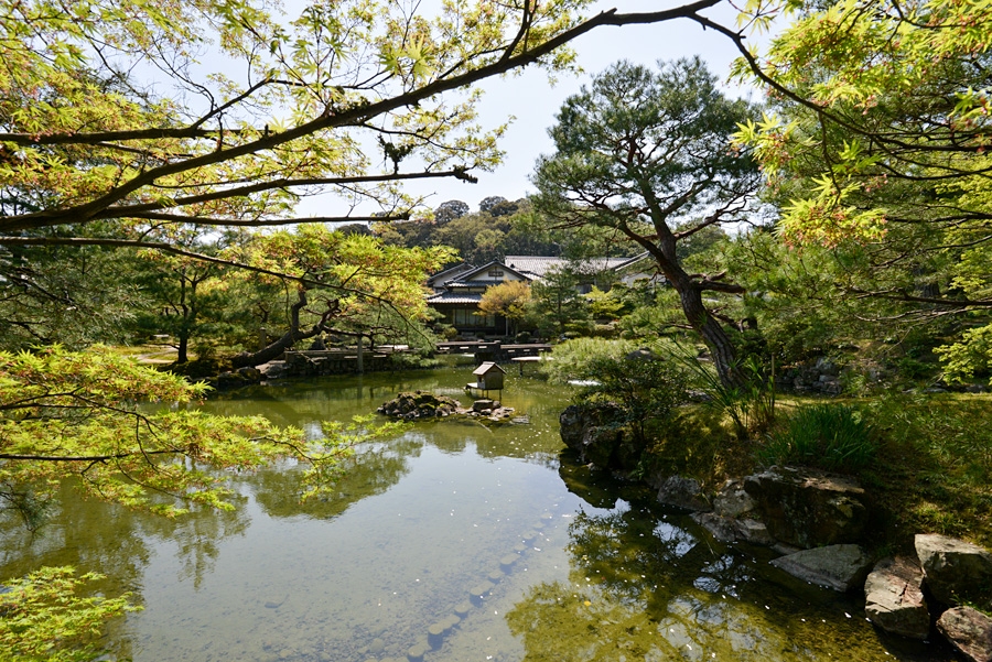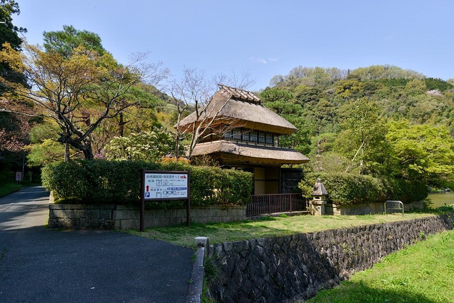 | Features | Sansuien has three styles of Japanese garden: "Chisen Garden" (pond fountain garden), "Roji" (garden next to the teahouse), and "Karesansui"(garden with dry landscape). The pond fountain garden and moat were built around 1920, and the garden next to the teahouse and the one with dry landscape were built around 1955. These three gardens have received high praise from experts as "each is continuous but independent". The abundant planting of trees (pines and thread leaf false cypress, etc.), shrubs (gardenia and azaleas, etc.) and ground-cover plant (Ardisia japonica and Liriope muscari, etc.) creates landscapes of four seasons. |