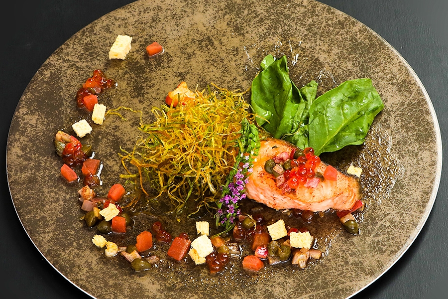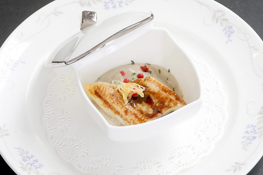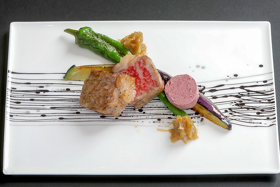 [Menu] French style Marinnated Bonito and Avocado Balsamique Viveger Sauce, Today's Soup, Grilled Sweet Fish with Mousse of Liver Tomato Sauce, Sirloin Steak Chinese Sauce in Eggplant and Pimiento, Aspargus Salad, Dessert / Coffee / Roll