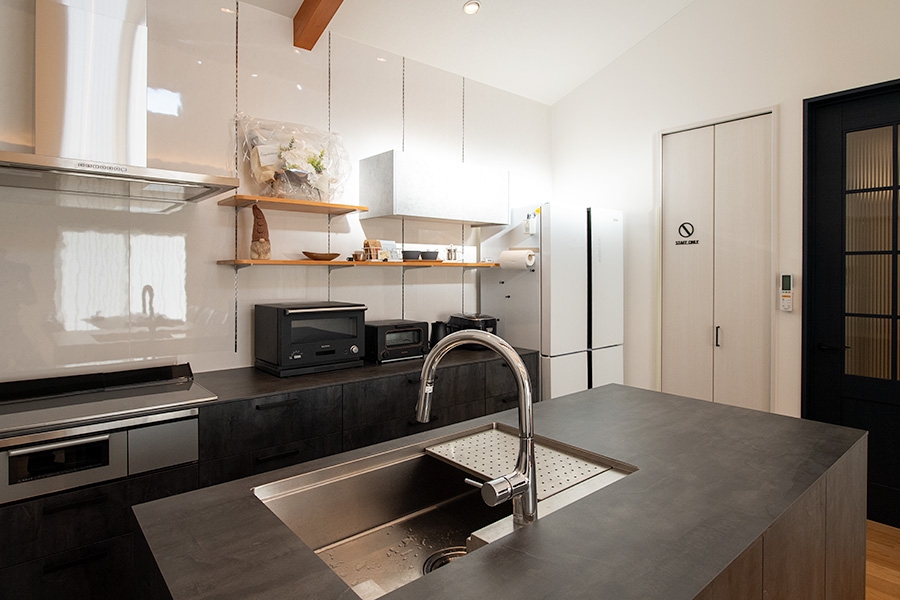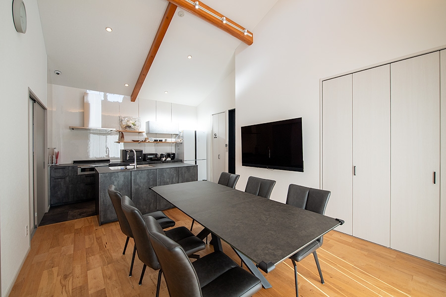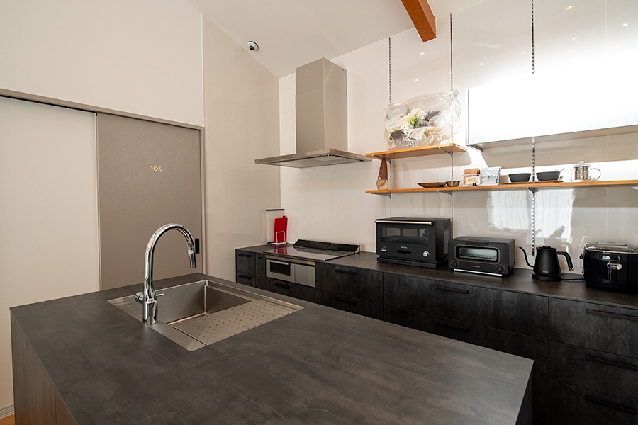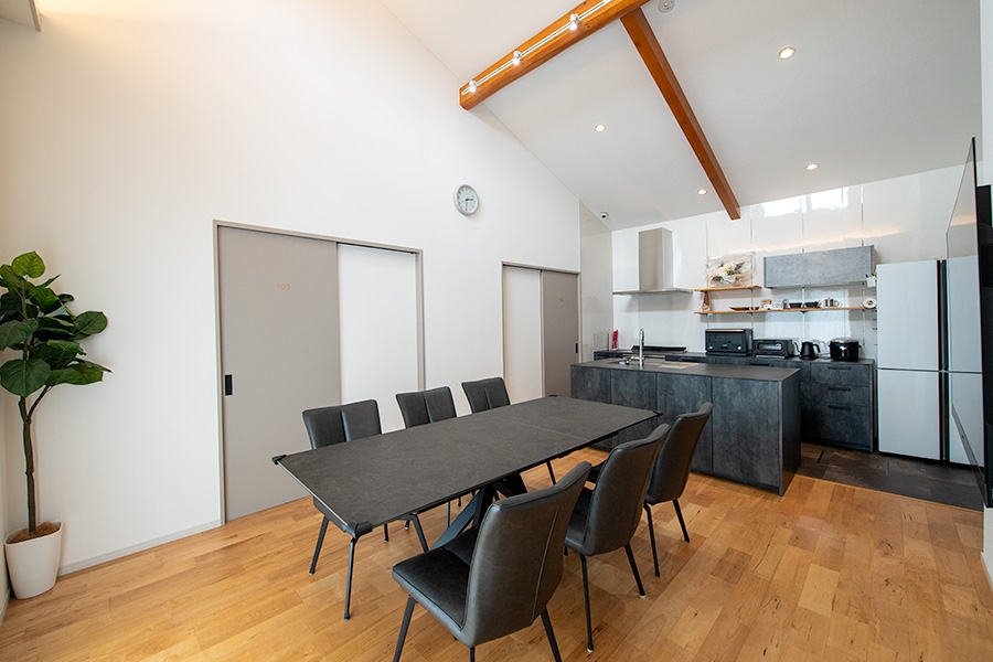 | 特長 | 一般的なホテルのような独立したリビングルームはありません。その代わりに、キッチンとダイニングが一体となった広々とした共有スペースが、宿泊する皆様の「リビング」として機能します。食事はもちろん、語らい、くつろぎの時間の中心となる、コミュニケーションが自然と生まれる空間です。 |