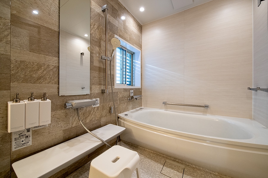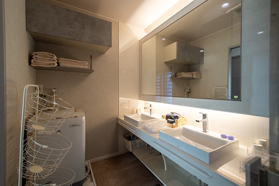 館内は、広めのバスルームや洗面・脱衣所や2箇所のトイレなどの共有スペースは、一棟貸しではプライベート空間としてご利用いただけます。どのスペースも清潔に保たれており、お客様がストレスなく快適な時間を過ごせるよう配慮されています。