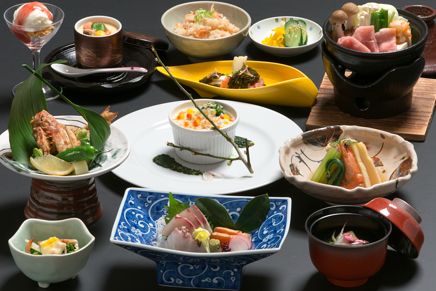 三方を海で囲まれた下関では、鮮度の良い魚介類が多く穫れます。有名なところでは、ふぐ、アンコウ等があり、季節により美味しい魚をお召し上がりいただいております。また、野菜や米などもなるべく地元産の時季のもので料理しています。料理は、和食が中心ですが、一品は洋食のエッセンスを取り入れてお出ししています。また、朝食はお米は釜で炊き、ご飯の美味しさを実感していただけるよう努力しています。