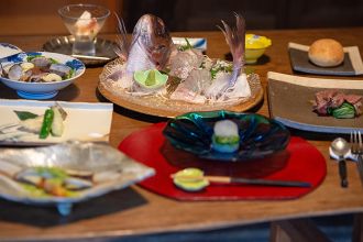 お食事(夕食・朝食)のご提供については、予約状況によっては徒歩3分の姉妹館、御舟宿いろはでのご提供が可能な場合がございます。ご希望の場合は、宿泊予約時にお問い合わせいただけると幸いです。夕食は一般的な旅館の料理とは異なり、和洋折衷の創作会席です。季節の地元の食材を中心に調理し、ひと工夫した料理をお出しします。日本料理をベースに今の感性をプラスした料理をゆっくりとお召し上がりください。