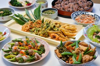 いっぱい作って大皿に盛り取り分けて食べるという、田舎本来のスタイルでお出ししています。世羅でできたもの、その時期に山や畑にある食材にこだわり、二人で献立を考えます。調理は主にときばぁばが手掛けます。アスパラのキムチは美味です。時期にはお出ししますので、ご賞味ください。