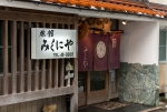 美又温泉の温泉街の真ん中辺りに、家紋の入った大きなのれんと格子が印象的な旅館みくにやがある。大きなガラスと木枠の引き戸を開けると、ひんやりと石が敷かれた玄関。老舗旅館の一つで、一番古い部分は明治時代からあるという建物を手入れし、湯治宿の風情を残す。
