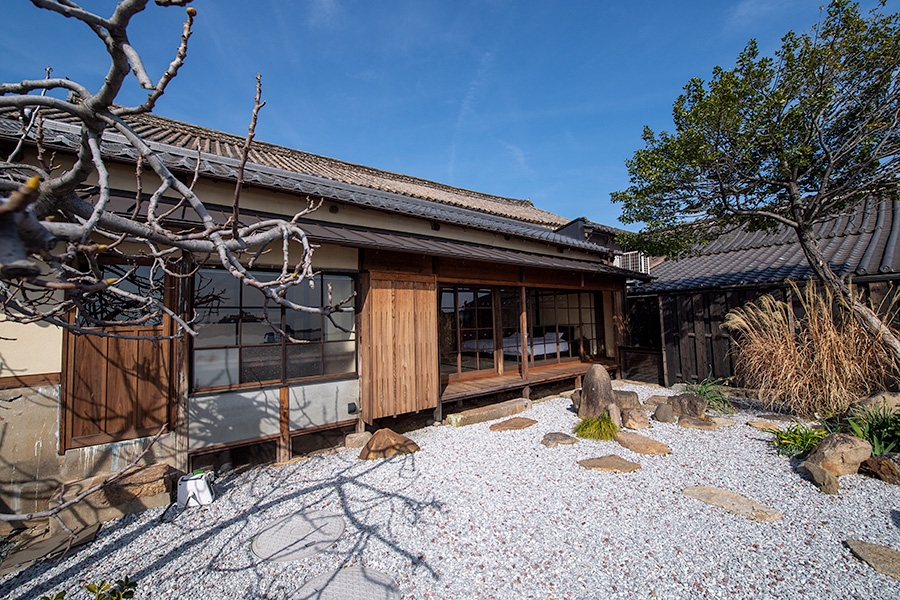 鞆の浦特有の細い路地。扉を開けて仄暗い路地を進んだその奥に一棟貸しの宿「御舟宿 海月」はある。鞆の浦のシンボルである常夜灯のすぐ傍らにありながら、その戸を開けることができるのは宿泊者のみ。路地は、たどり着いた者だけが享受できる外界の喧騒を遮断した特別な場所へと導く。