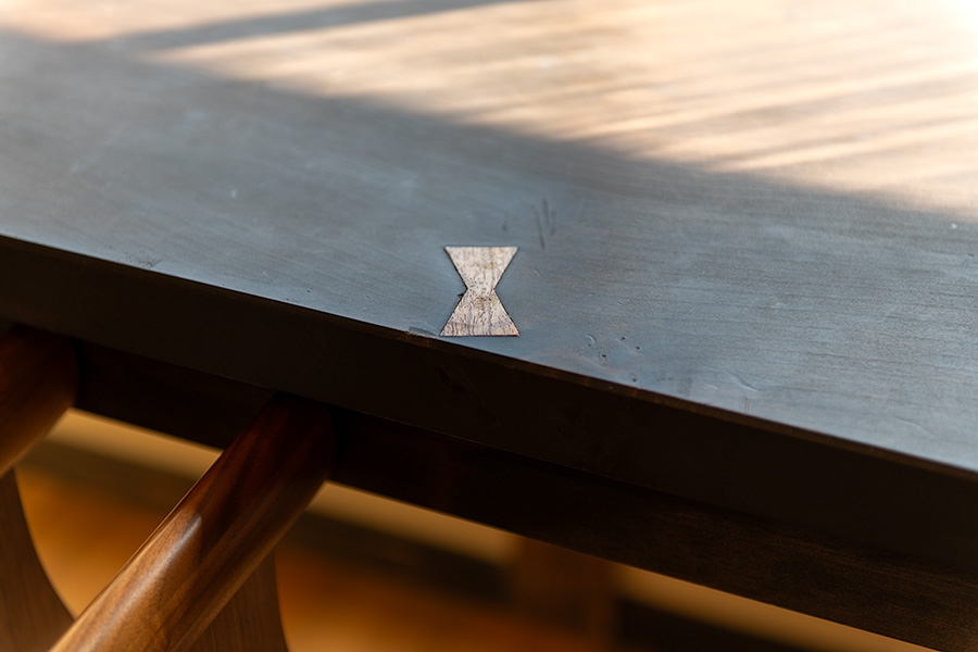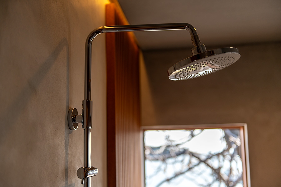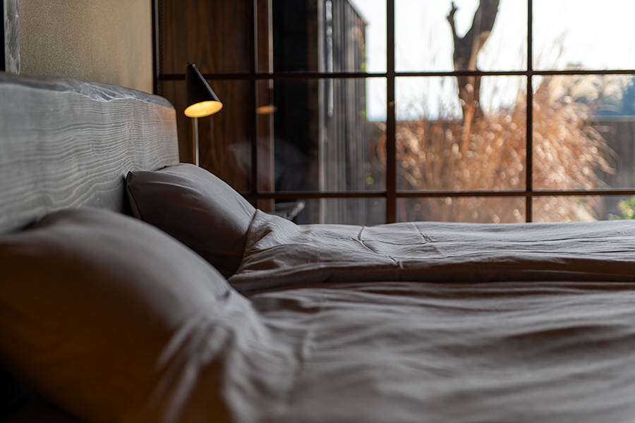 広いワンルームには、職人の手仕事で部屋に合わせてこしらえたベッド、テーブル、洗面台などが設えてあり、飛騨で研鑽を積んだ大工の「本物の木」へのこだわりが宿の質感を支えている。