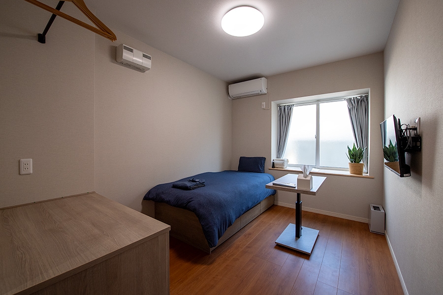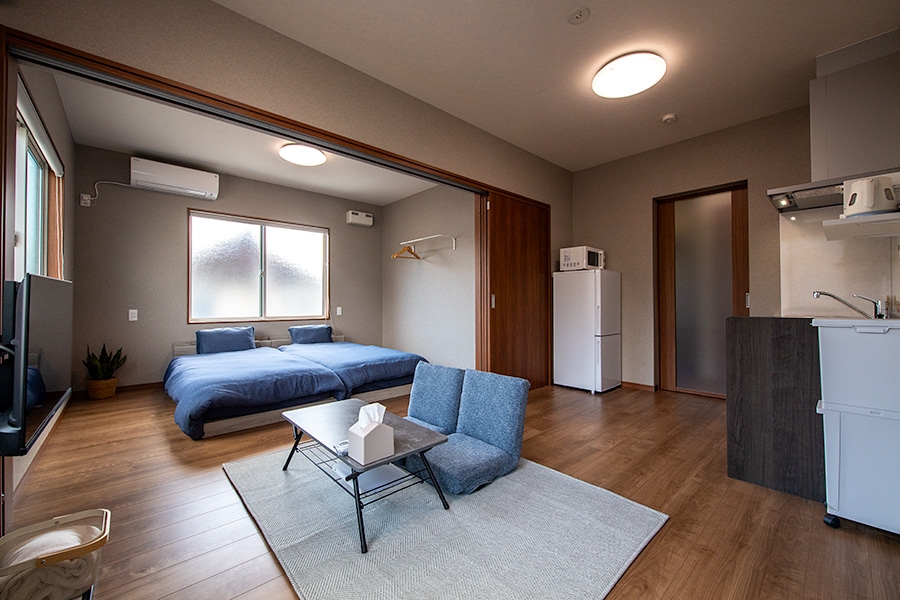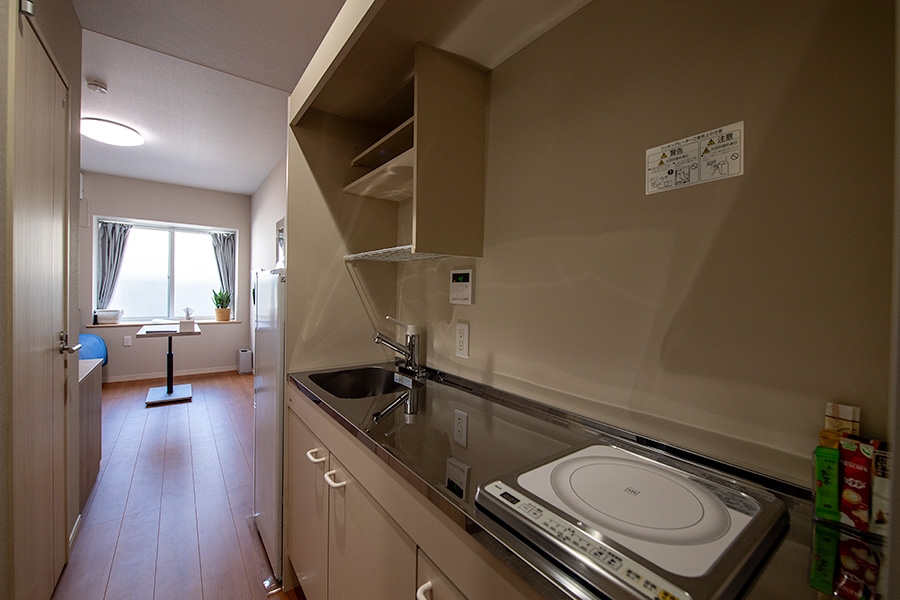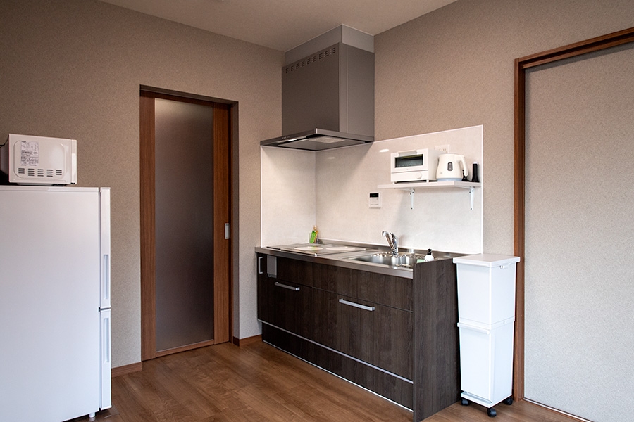 新館客室はシングル、ファミリータイプの二タイプございますが、どちらの部屋も独立したバスとトイレ、本格的なキッチンや洗濯機が備わっています。これは造船関係の仕事での滞在が多い地域性ということもあり、長期の滞在もできるようにしています。ホテルの客室というよりウィークリーマンションの様子に近いです。ここでの滞在を生活者としての視点で設備やサービスを心がけています。