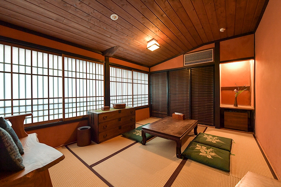 | 特長 | 蔵を改装して造られたお部屋。高い天井高と迫力の梁。築220年の町家式が直に感じられます。落ち着いた照明と隠し部屋のような雰囲気。宮崎監督は「かけおちもの部屋」と名付けました。ご夫婦やカップルで過ごしていただくのに向いているかと思います。 |