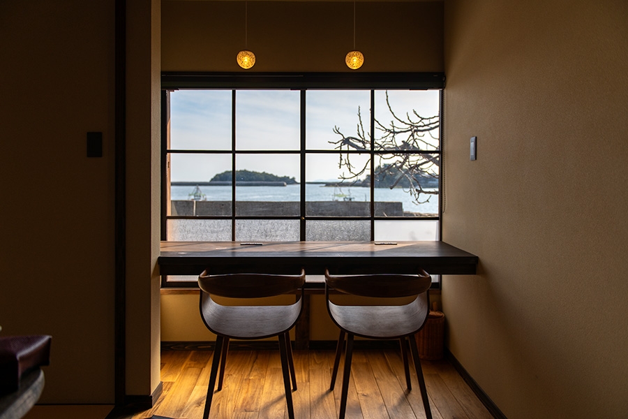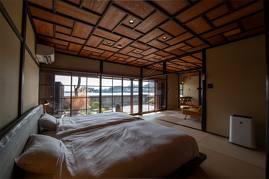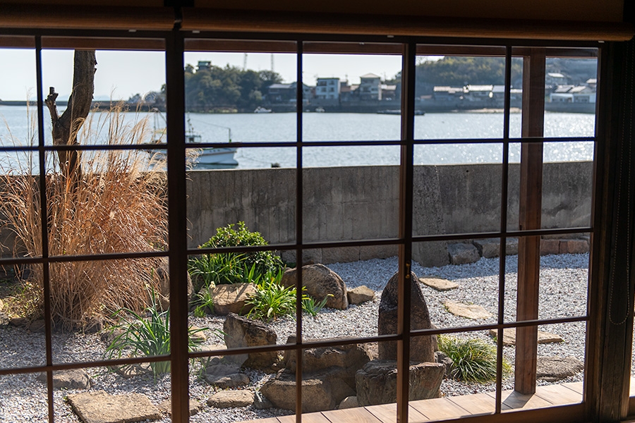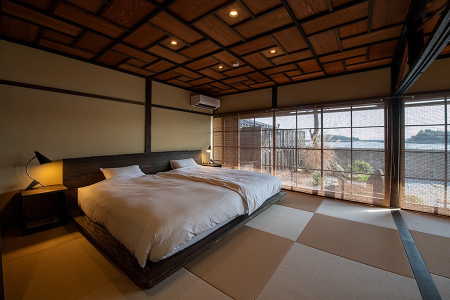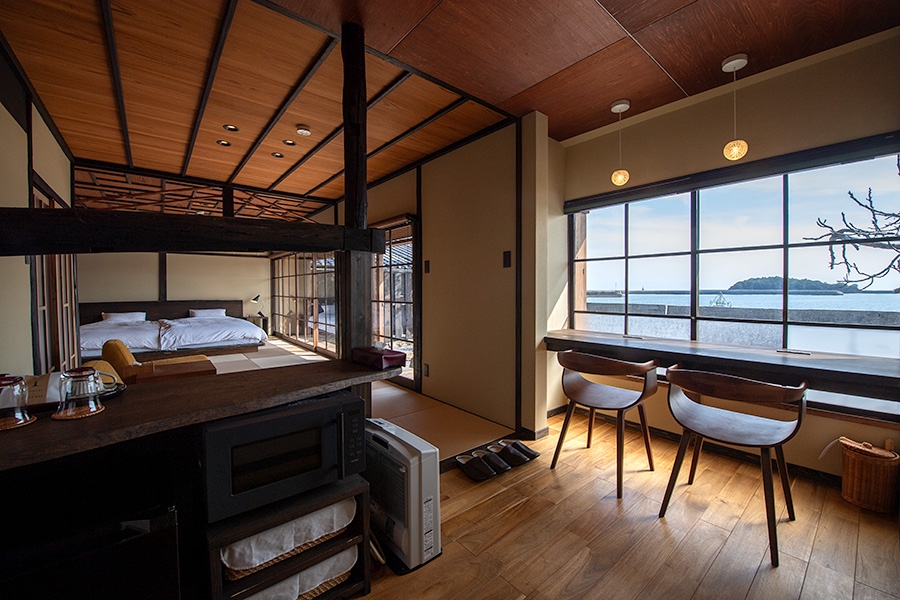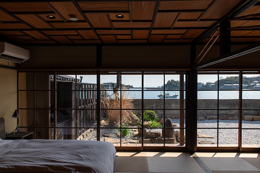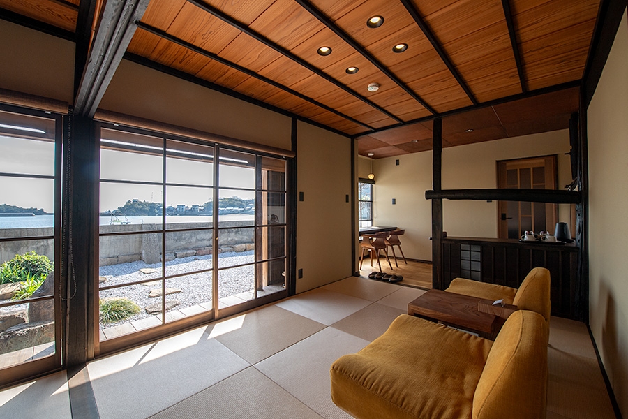築100年の建物を活かしたリノベーションで、あえて部屋を細かく区切らず、広々とした「ワンルーム」の構成にしています。これは一棟貸しだからこそできる贅沢であり、遮るものなく鞆の浦の風景や光を感じられるように意図されています。