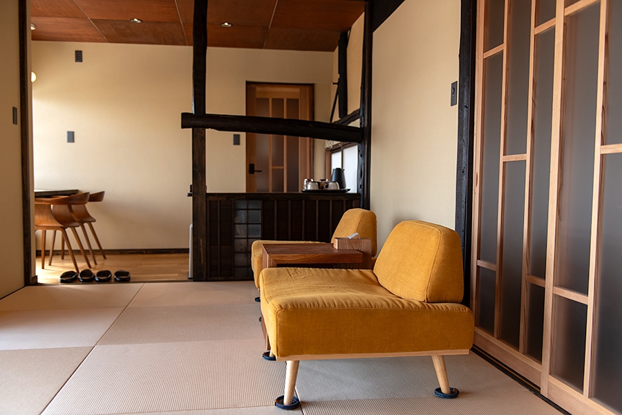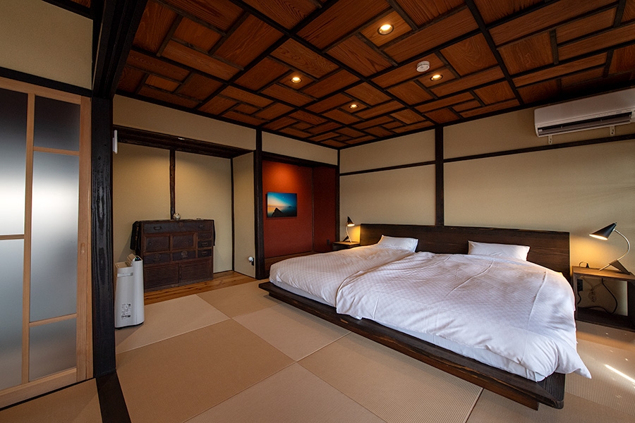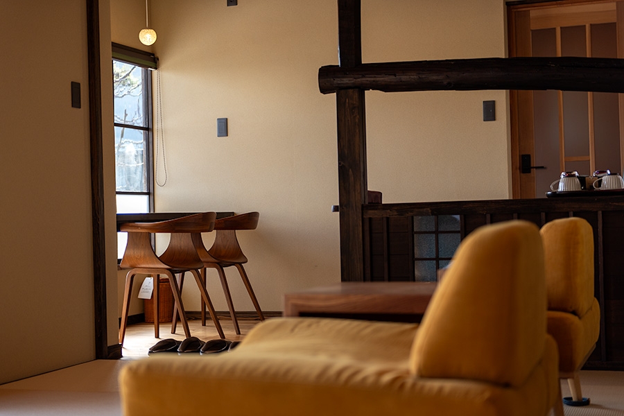 | 特長 | 飛騨で研鑽を積んだ大工・野島氏の手によって、ベッドやデスク、洗面台に至るまですべてがこの部屋のためだけにオーダーメイドで設えられました。力強い梁や伝統的な欄間を活かしつつ、洗練された家具を融合させた空間は、職人の手仕事による温もりと現代的な美意識が見事に調和しています。 |