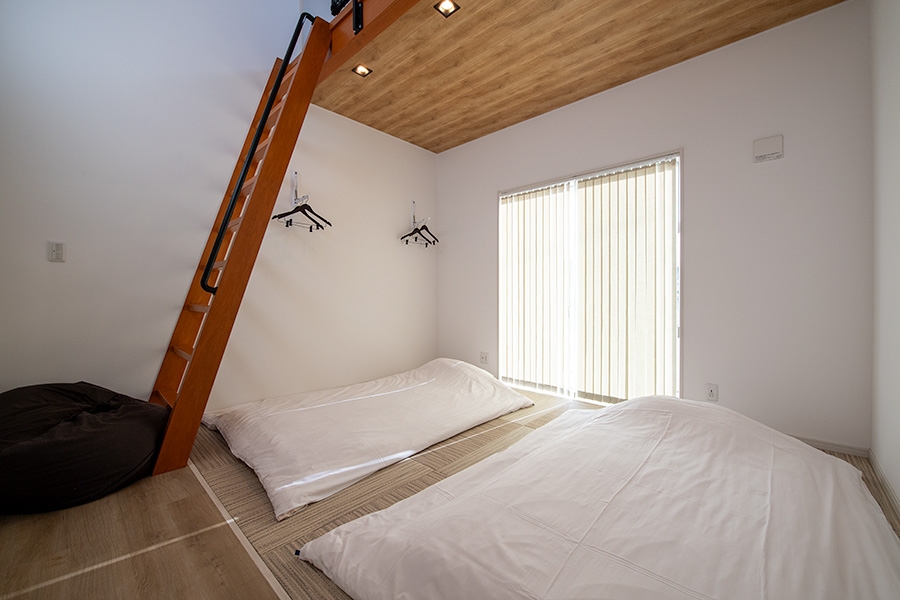 | 特長 | 階下のスペース和室に布団を敷き、木製のハしごを上ると秘密基地のようなロフトスペースが広がります。お子様連れのご家族や、友人グループでのご利用に人気です。ワクワクする空間が、旅の夜を一層楽しく演出します。 |