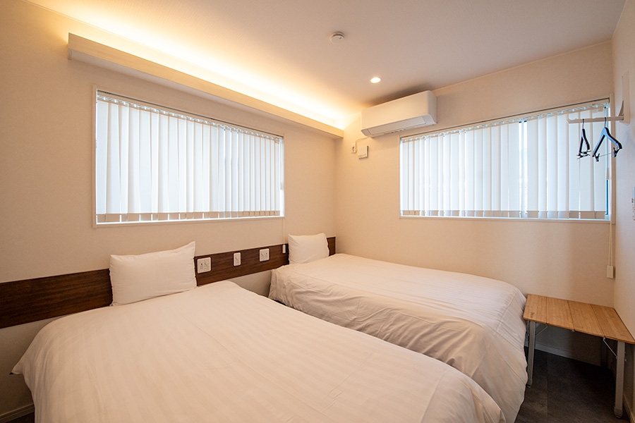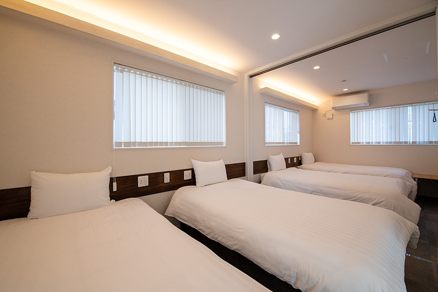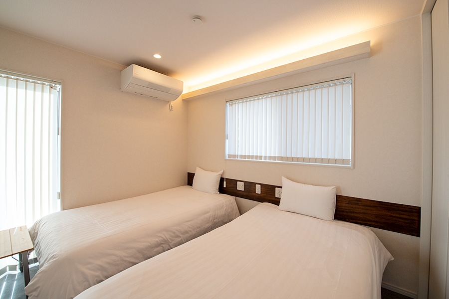 人数やグループ構成に合わせて選べる4つの部屋があります。どの部屋も白と木目を基調としたシンプルで清潔感のあるデザインで、旅の疲れを癒す落ち着いた空間となっています。また、テレビや冷蔵庫は置かず、リビング・ダイニングでの時間を楽しんでいただく設計にしました。